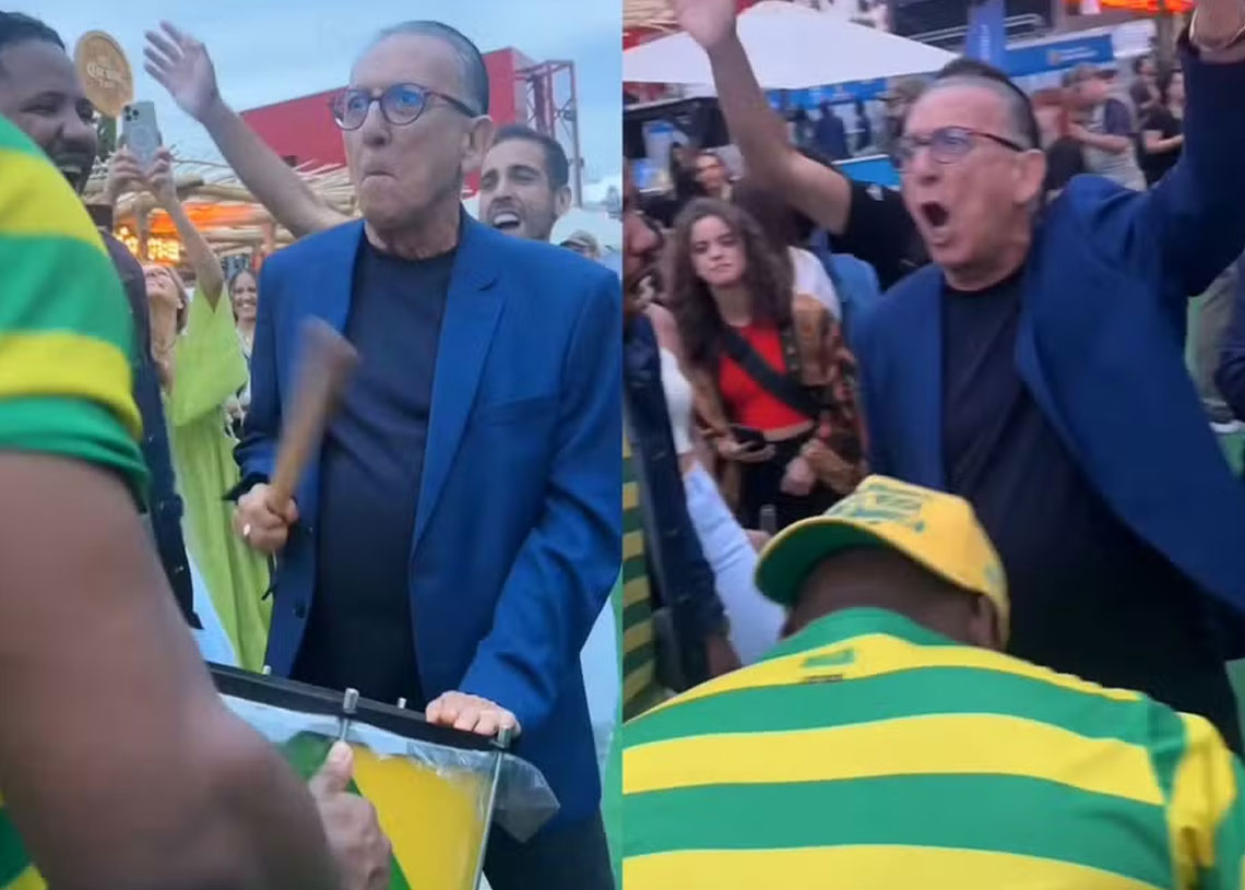 Galvão surgiu, na última sexta-feira, 26, tocando bateria com torcedores brasileiros em Paris. Em imagens, é possível ver o jornalista tocando junto com a bateria do Movimento Verde e Amarelo. Galvão Bueno esteve no comando da cerimônia de abertura dos Jogos Olímpicos com Luís Roberto, Daiane dos Santos e Ítalo Ferreira. Reprodução/@galvaobueno/Instagram
